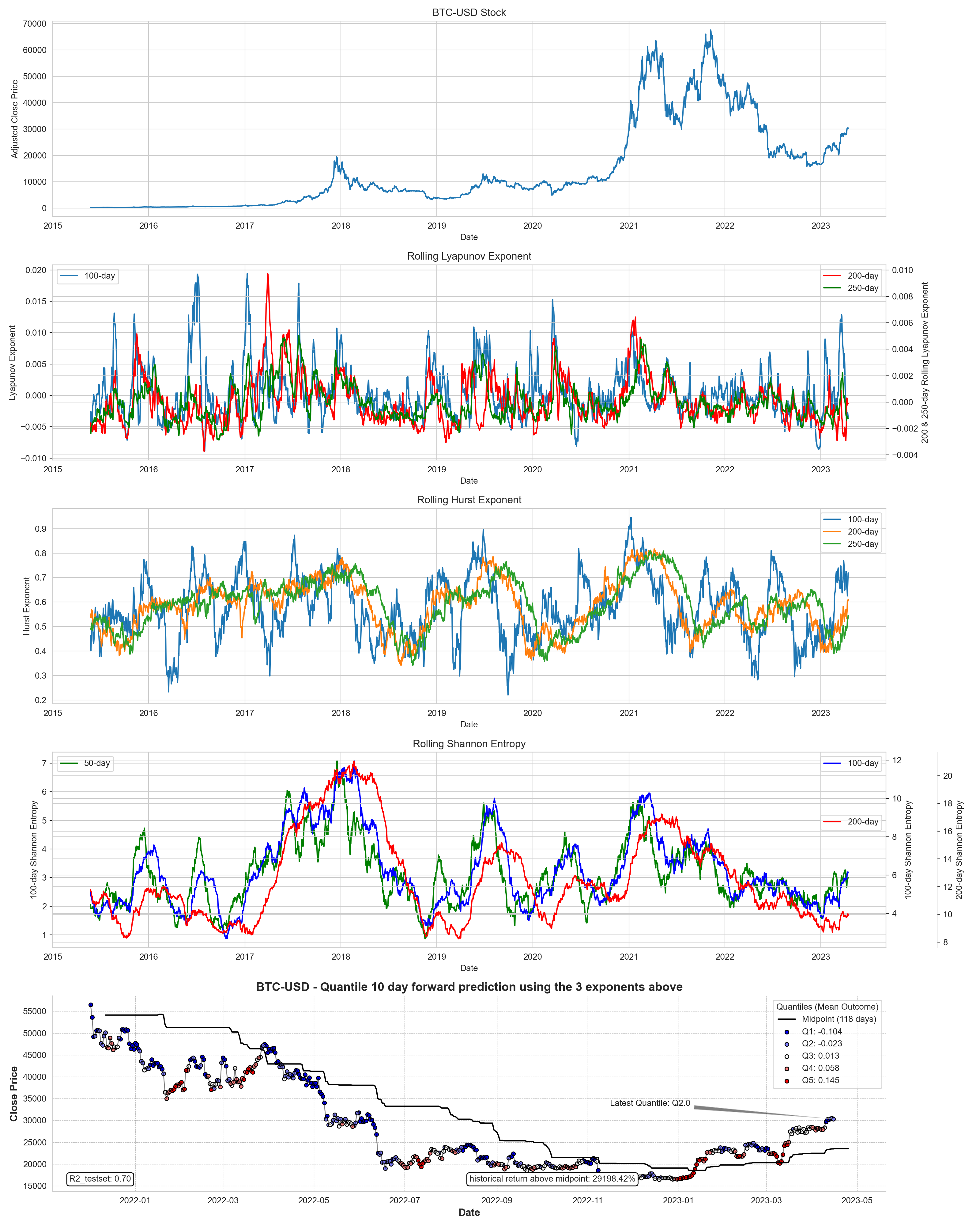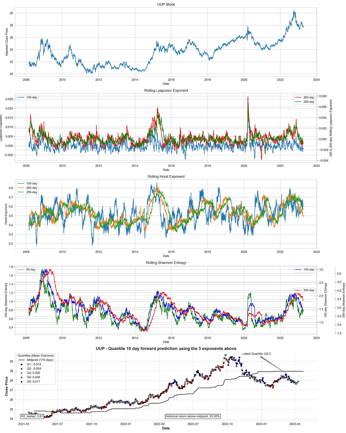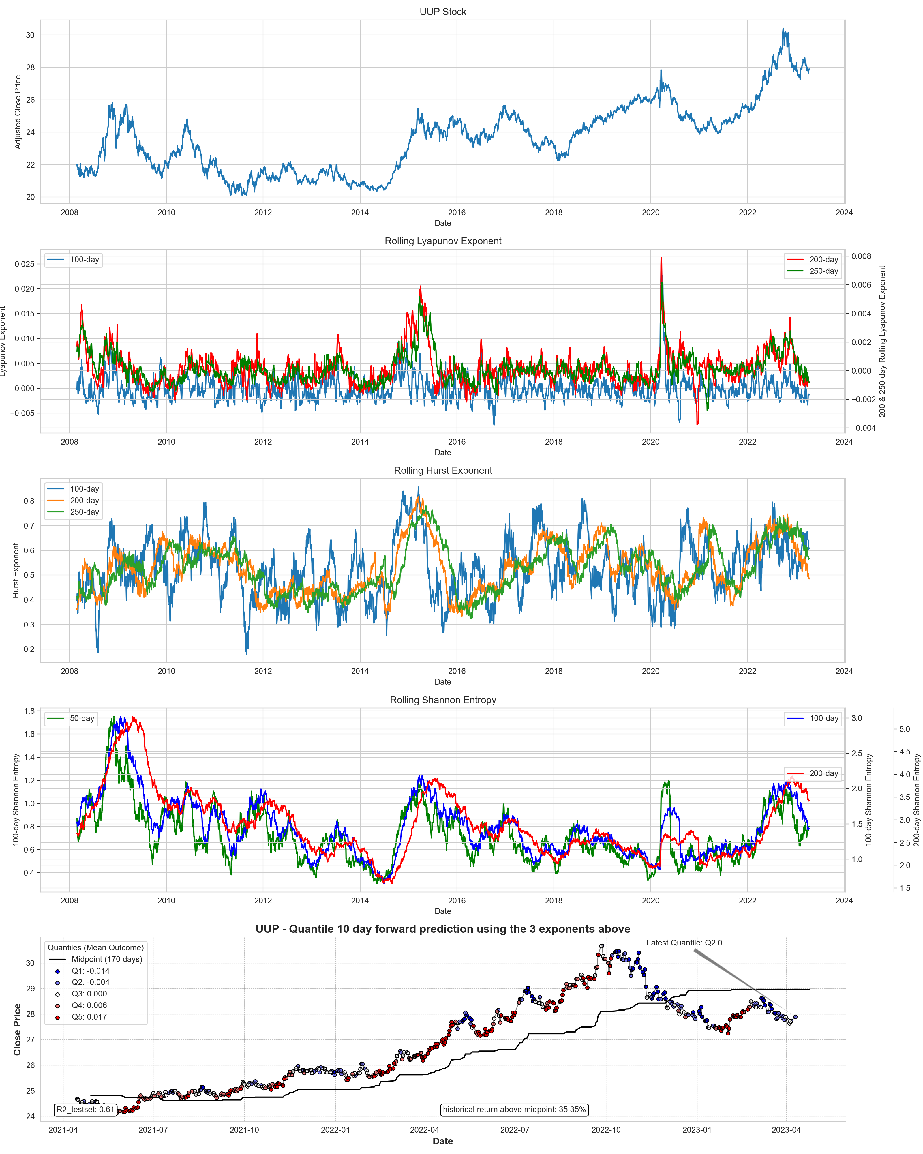 The Lyapunov exponents are currently in a stable range, which means that volatility should be low/medium in the near future. The rolling Lyapunov exponents indicate neither upward nor downward exponential movement. The Hurst exponents show anti-persistence across all rolling windows, so price and yield may zigzag in the near term. Entropy measures are still elevated relative to historical levels, so we are still in a period of quite unpredictable movements. A current positive sign is the decline in the rolling entropy measure, but it is still in the range of 2018/2019 values. The momentum channel is currently set to an optimal window of 180 days (optimization for maximum return with minimum channel crossover). Given the recent price action, we see a bullish breakout, which is quite strong given the current data, as the last quantile is 5. This means that the expected 10-day mean forward return is 0.044 or 4.4%. Each red dot in the last subgraph reflects the 5th quantile (for a historical perspective).