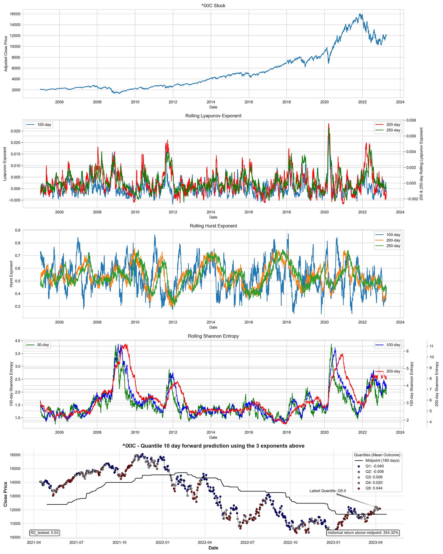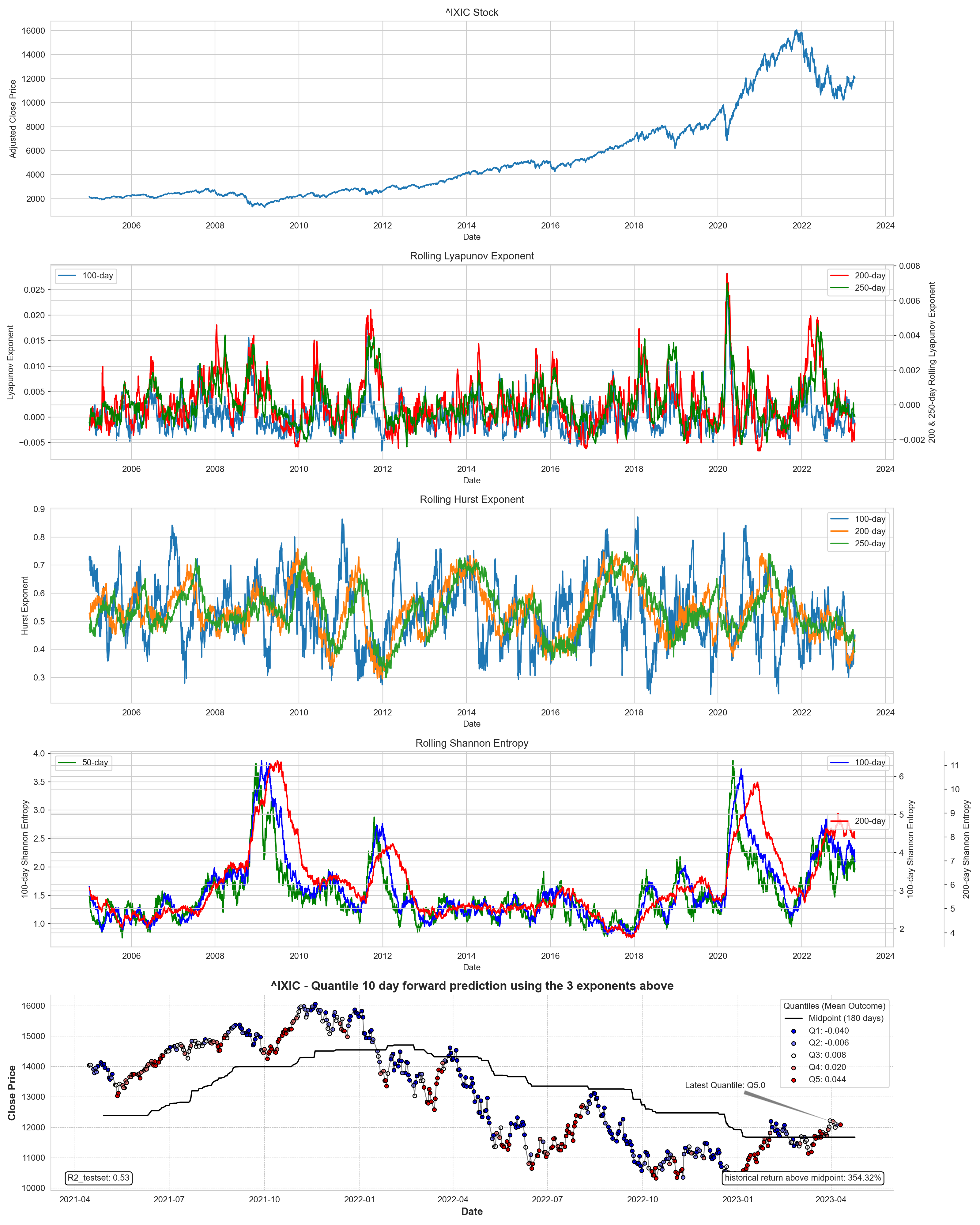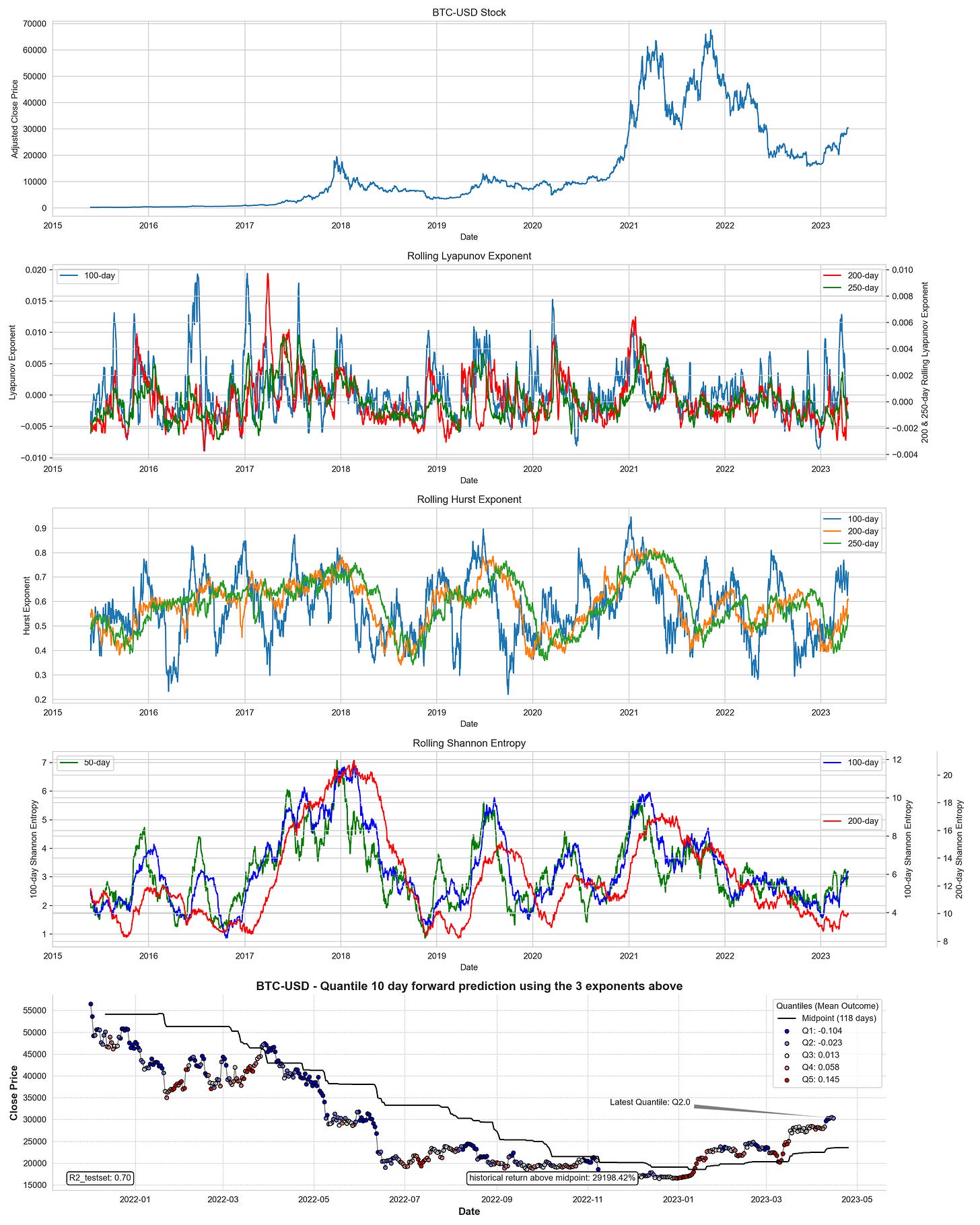 The Lyapunov exponents are currently in a stable range, which means that volatility should be low/medium in the near future. The rolling Lyapunov exponents indicate neither upward nor downward exponential movement. The Hurst exponents show anti-persistence across all rolling windows, so price and yield may zigzag in the near term. Entropy measures are still elevated relative to historical levels, so we are still in a period of quite unpredictable movements. A current positive sign is the decline in the rolling entropy measure, but it is still in the range of 2018/2019 values. The momentum channel is currently set to an optimal window of 180 days (optimization for maximum return with minimum channel crossover). Given the recent price action, we see a bullish breakout, which is quite strong given the current data, as the last quantile is 5. This means that the expected 10-day mean forward return is 0.044 or 4.4%. Each red dot in the last subgraph reflects the 5th quantile (for a historical perspective).